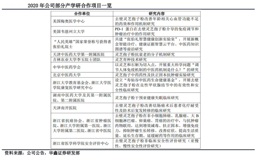 經(jīng)典案例:根據(jù)公司公告、華鑫證券研究部等綜合資訊表明,2021上半年,壽仙谷公司新簽訂產(chǎn)學(xué)研合作開發(fā)合同 14 項,目前在研產(chǎn)學(xué)研合作開發(fā) 項目共計 45 項。通過與高校、研究所等科研機(jī)構(gòu)的合作,其不斷探索靈芝等多種產(chǎn)品的藥用價值和保健功效。