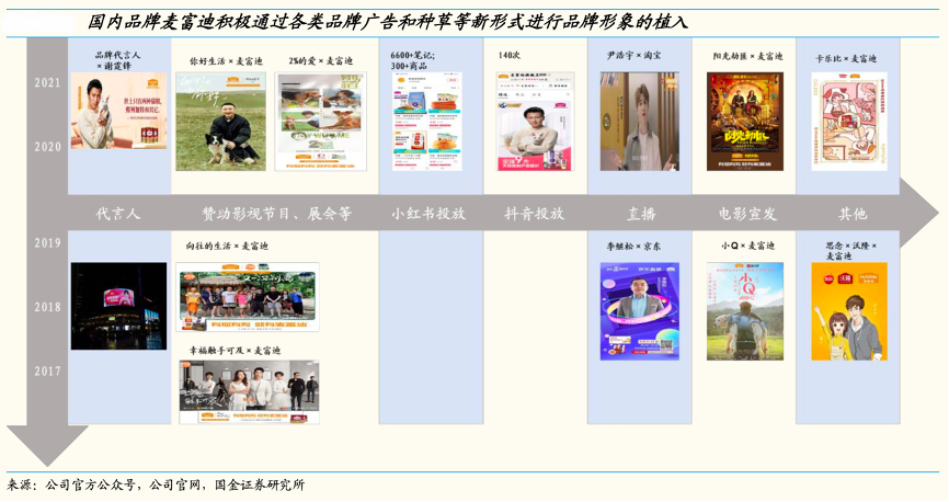 經(jīng)典案例:根據(jù)公司官方公眾號、公司官網(wǎng)和國金證券研究所等綜合資訊表明,相較于海外進(jìn)口品牌采用代理商模式進(jìn)行管理,國內(nèi)企業(yè)對于消費者需求變化感知、品牌推廣宣傳方面更加敏銳,其品牌構(gòu)建方面的戰(zhàn)略思維也較一般海外進(jìn)口品牌更加長遠(yuǎn),因此投入了更多品牌營銷資源和新興渠道資源。例如,麥富迪積極通過傳統(tǒng)品牌廣告 投放、以及抖音、直播、小紅書等新型品牌營銷相結(jié)合的方式,從長期構(gòu)建品牌形象。
