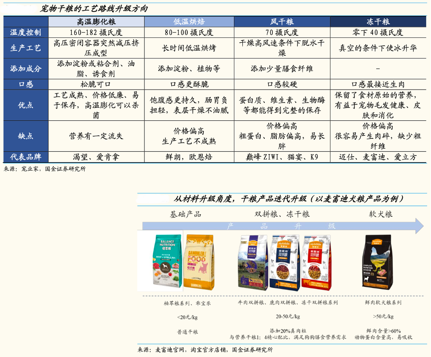 經(jīng)典案例:根據(jù)寵業(yè)家、麥富迪官網(wǎng)、淘寶官方店鋪、國金證券研究所等綜合資訊表明,從工藝發(fā)展的生命周期角度,干糧工藝路線發(fā)展已較為穩(wěn)定成熟,當(dāng)前創(chuàng)新升級的路線更多是在原有技術(shù)路線基礎(chǔ)上的工藝創(chuàng)新和材料配比創(chuàng)新。國產(chǎn)企業(yè)在原有膨化工藝不占優(yōu)勢的前提下,在凍干、風(fēng)干、低溫烘焙工藝方面不斷取得突破。從材料升級角度,干糧產(chǎn)品迭代升級更快速。