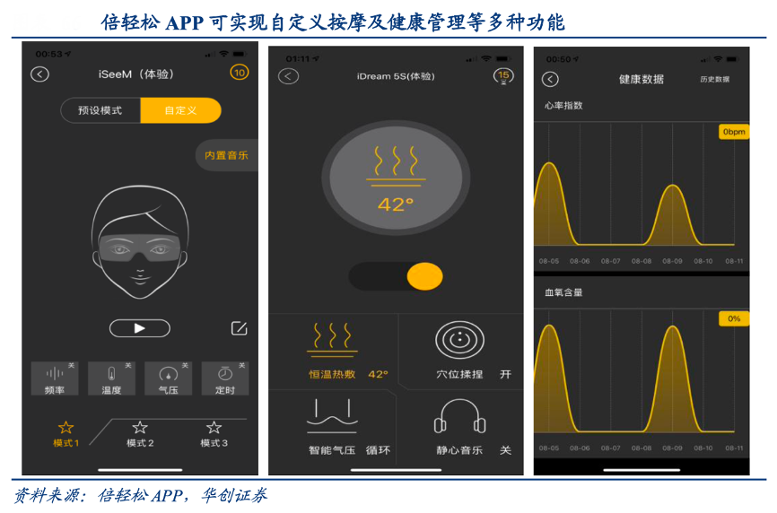 經(jīng)典案例:根據(jù)倍輕松APP、華創(chuàng)證券等綜合資訊表明,倍輕松用戶可通過手機(jī)等移動終端設(shè)備與按摩器相連接,監(jiān)測和管理個人健康狀況,并進(jìn)行溫度調(diào)節(jié)、按摩程式設(shè)計等自定義設(shè)置,同時還能 DIY 按摩組合。同時其在大數(shù)據(jù)分析的輔助下為用戶提供更豐富的健康服務(wù),如遠(yuǎn)程推送更適合的按摩程式。但當(dāng)前該技術(shù)研發(fā)應(yīng)用有限,除倍輕松 APP 外其他技術(shù)仍處研發(fā)階段。