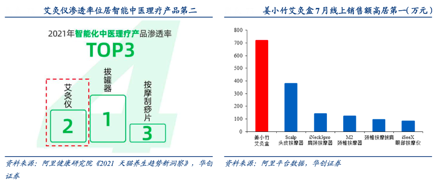 經(jīng)典案例:根據(jù)阿里健康研究院、阿里平臺數(shù)據(jù)、華創(chuàng)證券等綜合資訊表明,除眼部、頸部、頭部等現(xiàn)有主流產(chǎn)品外,倍輕松公司還在積極拓展新的產(chǎn)品矩陣以觸達(dá)更多消費人群。根據(jù)阿里健康研究院的數(shù)據(jù)顯示,在智能化中醫(yī)醫(yī)療產(chǎn)品中艾灸儀的滲透率高居第二,而倍輕松推出的“智能艾灸盒”采用真明火懸灸,燃燒釋放的有益微量元素可被人體吸收,7月銷售額達(dá)到 717.8 萬元,超過第二名約90%,位居公司 SKU 線上收入之首。