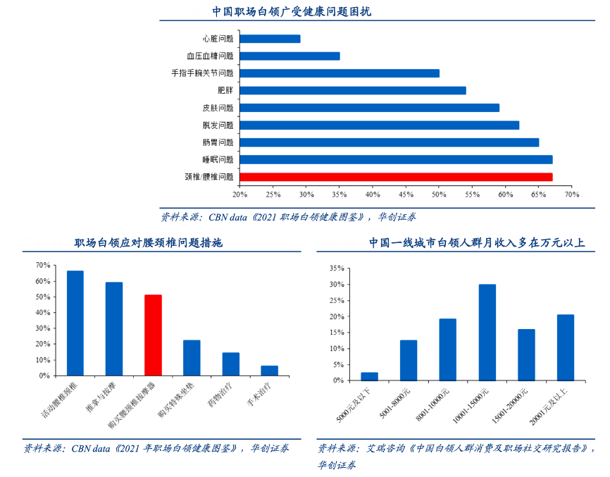 經(jīng)典案例:根據(jù)CBN data《2021年職場白領(lǐng)健康圖鑒》、華創(chuàng)證券、艾瑞咨詢《中國白領(lǐng)人群消費(fèi)及職場社交研究報(bào)告》等綜合資訊表明,在白領(lǐng)中腰椎/頸椎問題最為常見,比重達(dá)到 67%,是與睡眠問題并列的最普遍職場健康問題。