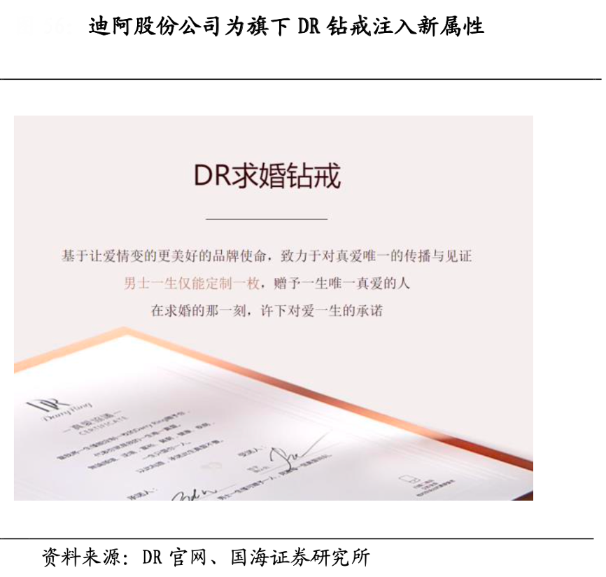 經(jīng)典案例:根據(jù)Dr官網(wǎng)、國海證券研究所等綜合資訊表明,近年來國內(nèi)新鉆戒 DR 開創(chuàng)了“一生只送一人”的購買規(guī)則,通過傳達“一生·唯一·真愛”的愛情觀為品牌鉆戒賦予新屬性,成為具有較強市場競爭力的求婚鉆戒品牌,招股說明書上 ROE 水平遠超同業(yè)上市公司。