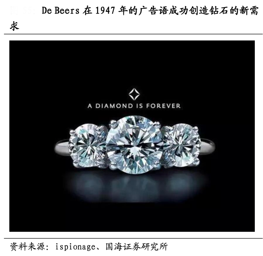 經(jīng)典案例:根據(jù)ispionage、國海證券研究所等綜合資訊表明,以高檔耐用品中的鉆戒為例,上世紀 De Beers 公司成功通過一句廣告語“a diamond is forever”,強化了鉆石和浪漫愛情的聯(lián)系,通過各類媒體營銷,成功將鉆戒與求婚場景綁定在一起,自此鉆戒成為全球求婚習俗,自此美國鉆石銷量扭轉(zhuǎn)了自大蕭條以來不斷下滑的態(tài)勢,三年內(nèi)上升了 55%,這一廣告語也被評為二十世紀最偉大的廣告語。