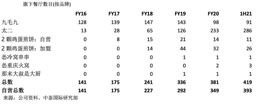 經(jīng)典案例:根據(jù)公司資料、中泰國(guó)際研究部等綜合資訊表明,九毛九旗下截至 2021年6月底,共有 419 家門(mén)店,其中 418 家位 處中國(guó)內(nèi)地,1 家位處加拿大。華南地區(qū)為集團(tuán)的大本營(yíng)及發(fā)跡地,其中共有 243 家門(mén)店。華中及華東、西部地區(qū)、華北及東北分別設(shè)有 122 家、21 家及 31 家門(mén)店。