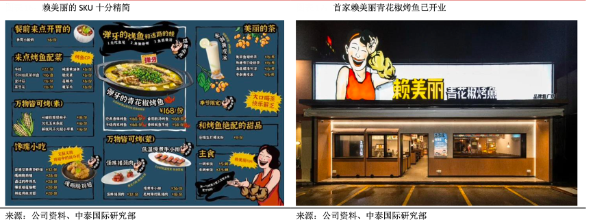 經(jīng)典案例:根據(jù)公司資料、中泰國(guó)際研究部等綜合資訊表明,九毛九旗下借鑒太二的經(jīng)驗(yàn),其再切入火鍋賽道,成立“慫重慶火鍋廠“,只賣(mài)一種鍋底-牛油辣搭果蔬鴛鴦鍋;SUK僅50個(gè)左右;店鋪融入酒吧、搖滾、夜店等風(fēng)格(包括每晚的跳舞環(huán)節(jié)“Happy Time”),與傳統(tǒng)的火鍋店不同。烤魚(yú)新品牌“賴(lài)美麗青花椒烤魚(yú)”已于 8 月 18 日在廣州馬場(chǎng)美食城開(kāi)業(yè)。賴(lài)美麗的產(chǎn)品延 續(xù)了九毛九一貫的風(fēng)格,SKU 只有 23 個(gè),十分精簡(jiǎn)。主要包括烤魚(yú)、燒烤、小吃、甜品數(shù)大類(lèi),僅賣(mài)一種魚(yú)-江團(tuán)魚(yú)。
