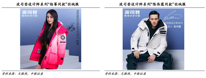 經(jīng)典案例:根據(jù)天貓網(wǎng)、中銀證券等綜合資訊表明,2018年,波司登公司啟動(dòng)全新戰(zhàn)略“聚焦主品牌”,攜手意大利設(shè)計(jì)師法比奧在水立方舉辦走秀,發(fā)布品牌戰(zhàn)略、“暢銷全球 72 國(guó)”品牌標(biāo)識(shí)與門店形象,為品牌重塑發(fā)聲。波司登設(shè)計(jì)師系列產(chǎn)品邀請(qǐng)楊冪、陳偉霆作為代言人,以“明星同款”撬動(dòng)粉絲經(jīng)濟(jì)紅利,推廣品牌的同時(shí)提升產(chǎn)品銷量。