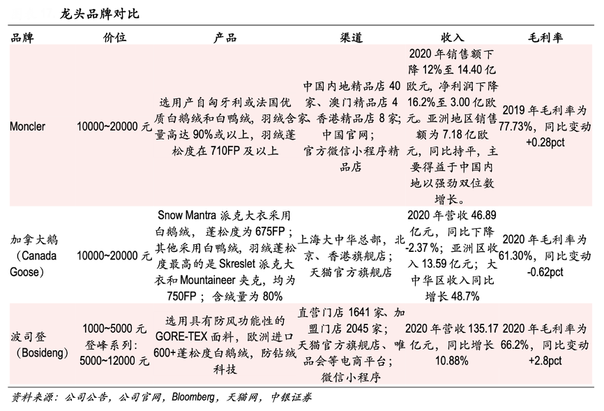 經(jīng)典案例:根據(jù)公司公告、公司官網(wǎng)、Bloomberg、天貓網(wǎng)、中銀證券等綜合資訊表明,國(guó)際品牌將高端產(chǎn)品帶入中國(guó)羽絨服市場(chǎng),刺激了中國(guó)市場(chǎng)對(duì)羽絨服時(shí)尚化與功能性的需求。時(shí)尚設(shè)計(jì)層面,Moncler 邀請(qǐng)?zhí)觳旁O(shè)計(jì)師、注重大牌 聯(lián)名打造冬季潮流,加拿大鵝以美觀的派克大衣款式得到包括眾多明星在內(nèi)的消費(fèi)者的喜愛。龍頭品牌羽絨蓬松度均在 600 以上,Moncler、波司登選擇同一家瑞士藍(lán)標(biāo)認(rèn)證羽絨供應(yīng)商的優(yōu)質(zhì)羽絨。波司登緊跟國(guó)際品牌腳步發(fā)展設(shè)計(jì)師聯(lián)名款,研發(fā)“登峰系列”提高蓬松度達(dá) 1000+、含絨量為極限 95%,與國(guó)際品牌比肩,繼續(xù)向中高端羽絨服品牌滲透。