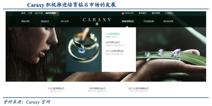 經(jīng)典案例:根據(jù)Caraxy、華創(chuàng)證券等綜合資訊表明,2015 年,Caraxy 在深圳珠寶展首次展出培育鉆石,推動中國培育鉆石起步,2018年成為首個入駐天貓平臺的培育鉆石品牌。2019年其推動中國首個培育鉆石鑒定分級團(tuán)隊標(biāo)準(zhǔn)的制定和政府備案。2021年其推出在線 3D 虛擬試戴中心,幫助客戶更好地選購產(chǎn)品。