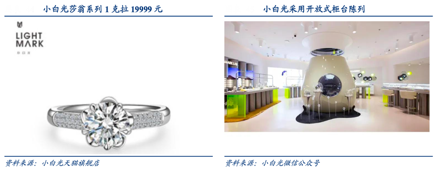經(jīng)典案例:根據(jù)小白光天貓旗艦店、小白光微信公眾號、華創(chuàng)證券等綜合資訊表明,國內(nèi)培育鉆石新興品牌小白光引領(lǐng)“克拉自由”新理念,2021年1月其在上海開設(shè)首家線下門店,其提供以 HPHT 法生產(chǎn) 的培育鉆石,推出終端售價為 19999 元的 1 克拉鉆戒的主打產(chǎn)品,希望基于材料創(chuàng)新、提供高性價比、更環(huán)保的鉆石產(chǎn)品,實現(xiàn)年輕人可負(fù)擔(dān)的奢侈,打造屬于 Z 時代的“克 拉自由”。
