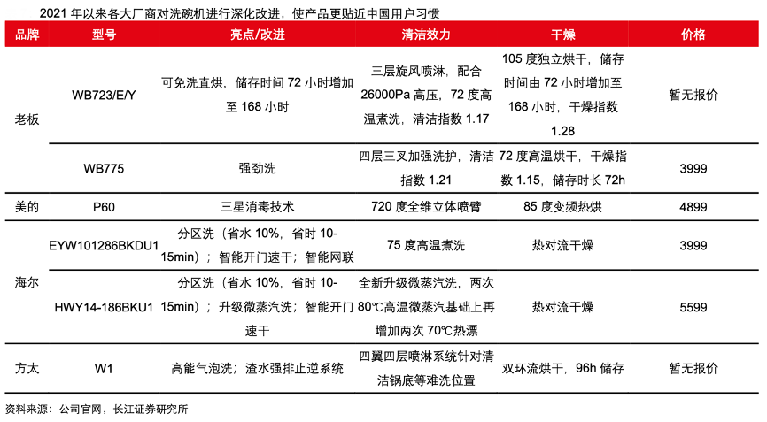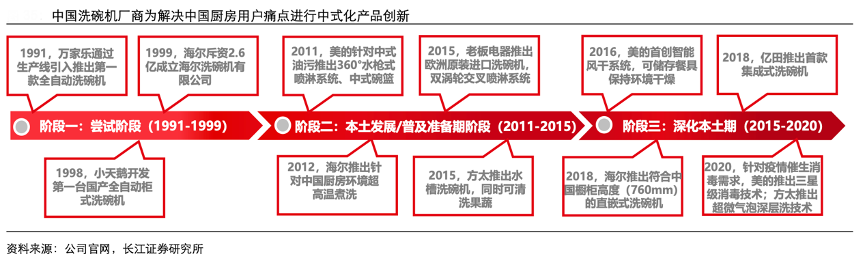 經(jīng)典案例:根據(jù)公司官網(wǎng)、長(zhǎng)江證券研究所等綜合資訊表明,最近十年,中國(guó)洗碗機(jī)廠商針對(duì)以上痛點(diǎn)對(duì)產(chǎn)品進(jìn)行中式化改進(jìn)。在清潔效果和碗籃問(wèn)題上,美的于 2011 年針對(duì)中式油污推出 360 度水槍式噴淋系統(tǒng),并主打中式碗籃設(shè)計(jì),方便中式餐具、鍋具的擺放,此后其他品牌也紛紛推出適改化產(chǎn)品;在嵌入高度問(wèn)題上,2018 年海爾首次推出符合中國(guó)櫥柜高度(760mm)的直嵌式洗碗機(jī)。
