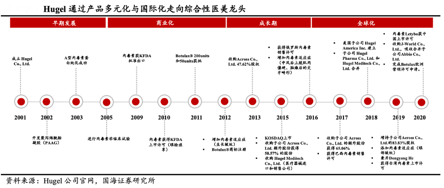 經典案例:根據(jù)Hugel公司官網、國海證券研究所等綜合資訊表明,經過 20 余年發(fā)展,Hugel通過產品多元化與布局海外市場,已成為韓國綜合性醫(yī)美龍頭。1)豐富產品矩陣、強化交叉銷售:Hugel產品矩陣包括 Letybo肉毒素、Chaeum 德彩玻尿酸、Dermalax 德瑪玻尿酸、Wellage 唯拉珠肌膚科學德 瑪化妝品、PR4 娉爾芙醫(yī)美專門護膚品牌等多個品項,通過提供多種產品滿足消費者多元化需求。2)國際化開辟海外市場:截至 2020 年底,其肉毒素、玻尿酸在美國、歐洲和中國等 30 個國家/地區(qū)獲得許可,預計 2023 年前覆蓋全 球 95%市場。