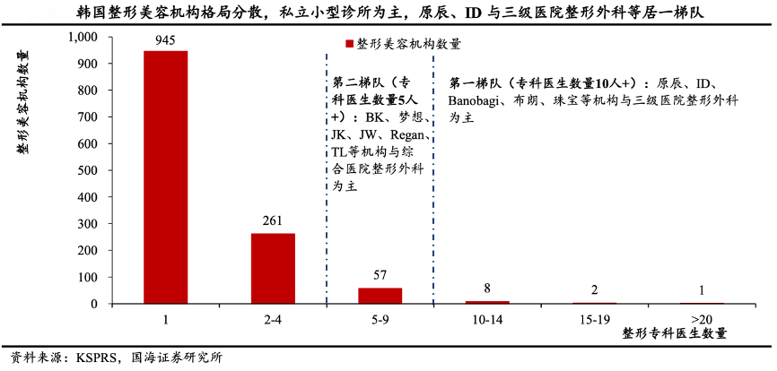 經典案例:根據(jù)KSPRS、國海證券研究所等綜合資訊表明,第一梯隊(專科醫(yī)生數(shù)量 10 人+)以原辰、ID、Banobagi、布朗、珠寶等大型機構與三級醫(yī)院整形外科為主;第二梯隊(??漆t(yī)生數(shù)量 5 人+)以 BK、夢想、JK、JW、Regan、TL 等中型機構與綜合醫(yī)院整形外科為主;第三、第四梯隊旗下??漆t(yī)生數(shù)量低于 4 人,私人小型 機構與醫(yī)院整形外科為主。