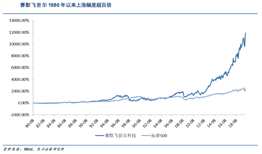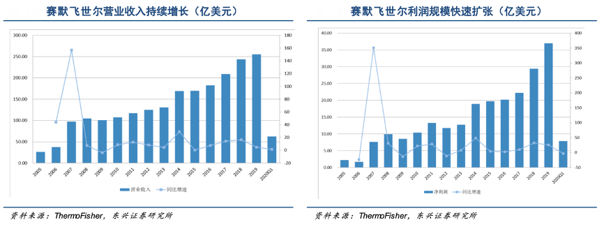 經(jīng)典案例:根據(jù)wind、東興證券研究所等綜合資訊表明,賽默飛世爾(Thermo Fisher)成立于 1956 年,前身為熱電公司(Thermo Electron Corporation),2007 年熱電公司和飛世爾合并成為賽默飛世爾公司。經(jīng)過幾十年的發(fā)展,賽默飛世爾已經(jīng)成長為全球雇員超過 7.5 萬人,年收入超過 255 億美元,市值超過 1379.1 億美元的全球儀器儀表領導者。