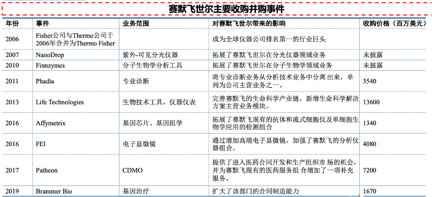 經(jīng)典案例:根據(jù)ThermoFisher、東興證券研究所等綜合資訊表明,賽默飛不斷收購在診斷領(lǐng)域擁有絕對技術(shù)領(lǐng)先優(yōu)勢的企業(yè),壯大完善產(chǎn)業(yè)鏈,自2013年收購Life Technologies后,其年銷售額在全球儀器公司排名中一直位列第一,且和第二名的差距不斷拉大。