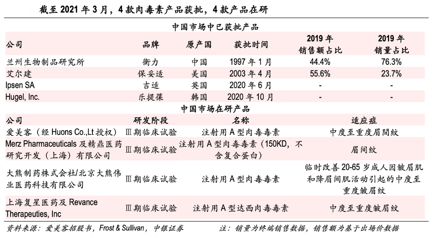 經(jīng)典案例:根據(jù)愛美客招股書、Frost&Sullivan、中銀證券等綜合資訊表明,當(dāng)前我國肉毒素類市場規(guī)??焖僭鲩L,結(jié)合Frost & Sullivan 數(shù)據(jù),2019年中國肉毒素市場出貨端銷售額為 36 億元,2016-2019 年 CAGR 達(dá)34%。截至 2021 年上半年合規(guī)市場產(chǎn)品僅四款獲證,分別為蘭州生物制品研究所的衡力、艾爾建美學(xué)的保妥適、Ipsen SA的吉適、Hugel, Inc.的樂提葆。