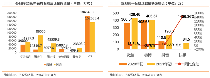 經(jīng)典案例:根據(jù)招股說明書、天風證券研究所等綜合資訊表明,截至目前,DR 已在微博、微信、抖音、快手、小紅書等知名互聯(lián)網(wǎng)平臺擁有超過2000萬粉絲,在社交類和視頻類平臺的粉絲數(shù)量均領先于同行業(yè)可比公司。以微博舉例,截止 2021 年 10 月 7 日,DR 相關熱門話題如“#dr#”、“#我是 dr 族#”、“#dr 鉆戒#”、“#亞洲 dr 男神評選#”、“#Yes to DR#” 等有近 20 億次的閱讀以及約 48 萬次的討論,在以上話題中,DR 通過情感話題、“男神評選”等制造熱點,吸引流量,從而與大批消費者或潛在消費者之間形成良好的互動關系。