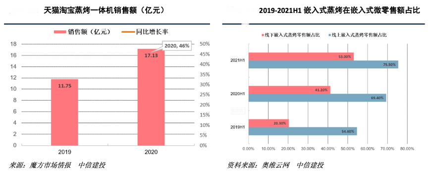 根據(jù)魔鏡市場(chǎng)情報(bào)統(tǒng)計(jì),2020年桃溪與京東平臺(tái)蒸烤一體機(jī)銷售額合計(jì)約 28 億元,其中淘系平臺(tái)蒸烤一體機(jī)銷售額約 17.13 億元,同比增速達(dá)46%。從奧維云網(wǎng)(AVC)數(shù)據(jù)來(lái)看,嵌入式蒸烤一體機(jī)在嵌入式微零售中的占比亦呈現(xiàn)逐年提高的趨勢(shì)。