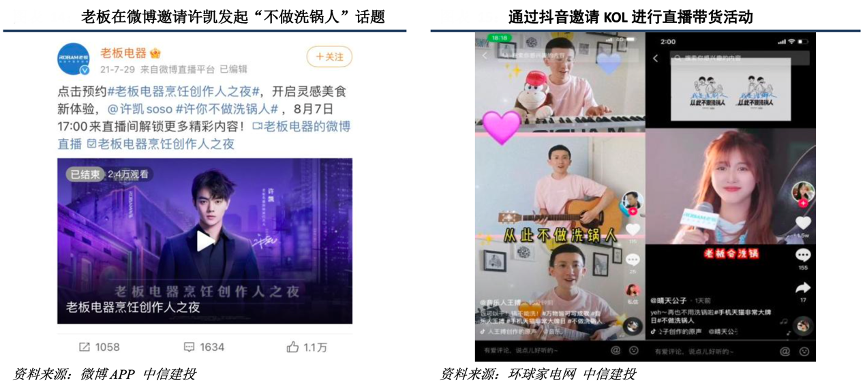 經(jīng)典案例:根據(jù)微博APP、環(huán)球家電網(wǎng)、中信建投等綜合資訊表明,洗碗機(jī)品類消費(fèi)者主要集中于80和90后的年輕群體,對(duì)于新興互聯(lián)網(wǎng)模式的營(yíng)銷推廣接受程度更高。從需求端消費(fèi)群體的這一特點(diǎn)出發(fā),老板自發(fā)力洗碗機(jī)品類以來(lái)借助明星直播、話題討論、抽獎(jiǎng)互動(dòng)等一系列新興產(chǎn)品推廣方式提升產(chǎn)品曝光度。勢(shì)頭迅猛且迎合年輕消費(fèi)群體的營(yíng)銷方式為老板洗碗機(jī)品類短期內(nèi)市場(chǎng)份額的快速提升提供了強(qiáng)大助力。