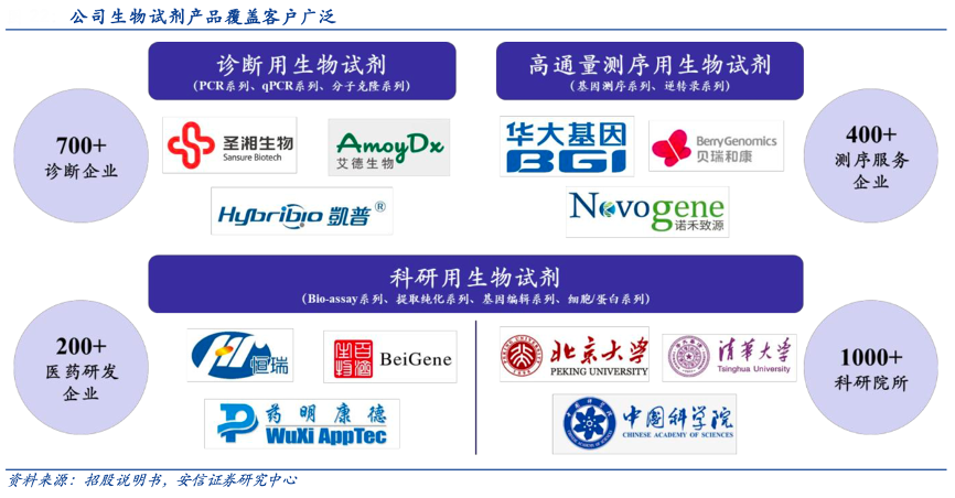 經(jīng)典案例:根據(jù)招股說明書、安信證券研究中心等綜合資訊表明,諾唯贊公司生物試劑下游應(yīng)用豐富,其生物試劑產(chǎn)品可以分為科研用生物試劑、診斷用生物試劑、高通量測(cè)序用生物試劑。其目前覆蓋北大、清華、中科院等1,000 多所科研院校,同時(shí)覆蓋藥明康德、恒瑞醫(yī)藥、百濟(jì)神州等 200 多家制藥企業(yè)及CRO企業(yè)。