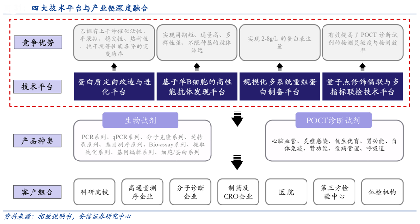 經(jīng)典案例:根據(jù)招股說明書、安信證券研究中心等綜合資訊表明,諾唯贊公司主營業(yè)務(wù)的延展性極強(qiáng),從基礎(chǔ)科研工具、到基因測(cè)序原料、到 POCT 市場(chǎng)、到分子診斷原料、到生物醫(yī)藥領(lǐng)域,其是國內(nèi)少數(shù)同時(shí)具有自主可控上游技術(shù)開發(fā)能力和終端產(chǎn)品生產(chǎn)能力的研發(fā)創(chuàng)新型企業(yè),通過開拓下游應(yīng)用的方式可以不斷打破成長瓶頸,在不同的發(fā)展階段煥發(fā)出不同的生命活力。