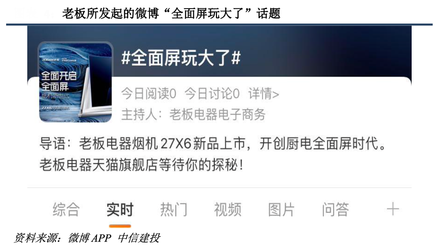 經(jīng)典案例:根據(jù)微博APP、中信建投等綜合資訊表明,老板近年積極迎合媒體發(fā)展新趨勢,為傳統(tǒng)煙灶品類打造了一系列年輕化營銷方案。舉例來說,2018 年老板在微博發(fā)起“全面屏玩大了”話題為款全面屏油煙機 27X6 造勢,活動期間話題熱度一度達到 20 萬,極大吸引了年輕消費群體,使得產(chǎn)品曝光度大幅提升。