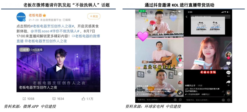 經(jīng)典案例:根據(jù)微博APP、環(huán)球家電網(wǎng)、中信建投等綜合資訊表明,洗碗機(jī)品類消費(fèi)者主要集中于 80 和 90 后的年輕群體,對(duì)于新興互聯(lián)網(wǎng)模式的營(yíng)銷推廣接受程度更高。從需求端消費(fèi)群體的這一特點(diǎn)出發(fā),老板自發(fā)力洗碗機(jī)品類以來(lái)借助明星直播、話題討論、抽獎(jiǎng)互動(dòng)等一系列新興產(chǎn)品推廣方式提升產(chǎn)品曝光度。勢(shì)頭迅猛且迎合年輕消費(fèi)群體的營(yíng)銷方式為老板洗碗機(jī)品類短期內(nèi)市場(chǎng)份額的快速提升提供了強(qiáng)大助力。