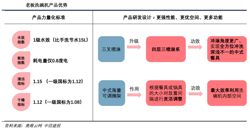 經(jīng)典案例:根據(jù)奧維云網(wǎng)、中信建投等綜合資訊表明,以油煙機(jī)為例,自業(yè)內(nèi)率先提出“大吸力”概念以來(lái),老板在 2012 年又提出“攏吸、強(qiáng)濾、速排、 節(jié)能”大吸力油煙機(jī)的四大標(biāo)準(zhǔn),之后依托自身技術(shù)積累又在業(yè)內(nèi)率先推出雙腔大吸力油煙機(jī)新品,并同時(shí)發(fā)布第五代大吸力油煙機(jī)標(biāo)準(zhǔn)。產(chǎn)品端持續(xù)的技術(shù)迭代創(chuàng)新使得老板煙灶品類的產(chǎn)品力始終領(lǐng)先于同業(yè),這也構(gòu)成其穩(wěn)固并不斷提升自身高端市場(chǎng)份額的堅(jiān)實(shí)基礎(chǔ)。