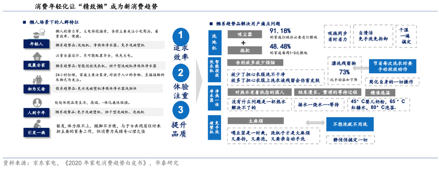 經(jīng)典案例:根據(jù)京東家電、《2020年家電消費(fèi)趨勢白皮書》、華泰研究等綜合資訊表明,隨著消費(fèi)者年齡代際的持續(xù)更替,家電消費(fèi)正加速進(jìn)入 90 后、00 后主導(dǎo)的 時(shí)代,其中又以掃地機(jī)器人、洗地機(jī)等智能家電最為明顯。年輕消費(fèi)主力消費(fèi)能力明顯提升,并且強(qiáng)調(diào)品質(zhì)消費(fèi),因而“精致懶”已經(jīng)成為一大新消費(fèi)趨勢。