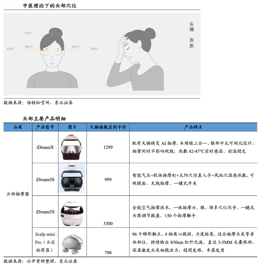 經(jīng)典案例:根據(jù)倍輕松官網(wǎng)、公開資料、東北證券等綜合資訊表明,頭部產(chǎn)品 iDream 和 Dream 系列可提供頭頸眼等多部位立體保健按摩。以目前熱銷的 iDream 5s 為例,其內(nèi)含 150 多個(gè)按摩觸手,可實(shí)現(xiàn)頭、眼和頸部的多穴位同步氣壓按摩,疏通經(jīng)絡(luò),搭配治愈音樂,可以極大的緩解工作壓力,改善睡眠狀態(tài)。