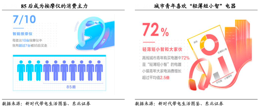 經(jīng)典案例:根據(jù) 2020京東《新時代帶電生活圖鑒》、東北證券等綜合資訊表明,70%以上的智能按摩儀被85后購買,而城市青年購買電器中的72%是“輕薄短小智”的電器。而倍輕松公司產(chǎn)品定位精準把握了商務(wù)白領(lǐng)、高端消費者 和校園大學生這類消費群體,這一類消費者年輕,對價格不敏感,對高端產(chǎn)品的訴求是顏值驚人、造型獨特和包裝精美。