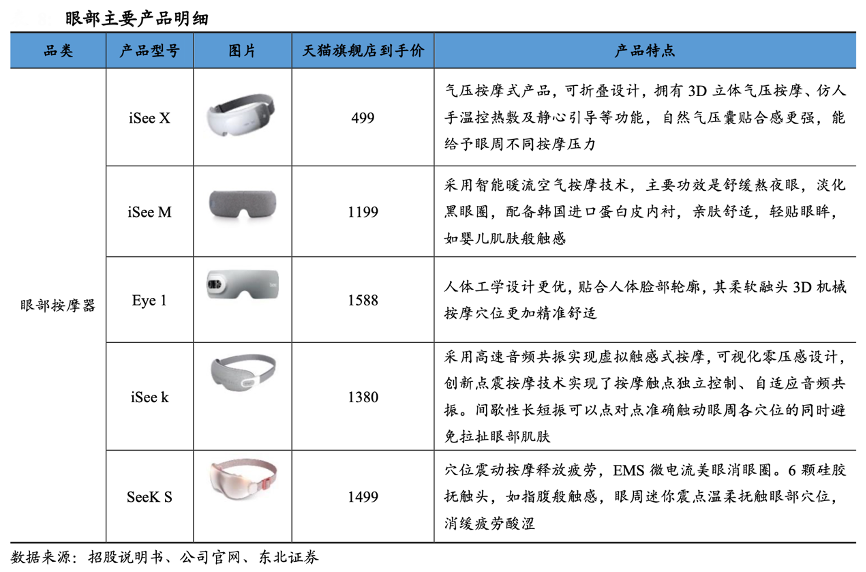 經(jīng)典案例:根據(jù)招股說明書、公司官網(wǎng)、東北證券等綜合資訊表明,倍輕松旗下產(chǎn)品可以提供機械、音頻和氣囊等多種按摩手法,以熱銷的 iSee M 為例,其主打氣囊按摩,內(nèi)置 6 個氣囊可以精準輕巧按摩太陽穴、攢竹穴、承泣穴,內(nèi)襯材質(zhì)選用韓國進口蛋白皮,更加貼近嬰兒肌膚觸感。整體上看,眼部產(chǎn)品通過中醫(yī)理論引入和真人揉按還原,可以極大的提高按摩療效。