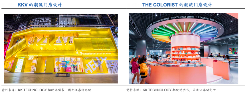 經(jīng)典案例:根據(jù)KK TECHNOLOGY招股說明書、國元證券研究所等綜合資訊表明,KK集團以“小清新”的彩色元素為特點,從空間布置、色彩搭配、產(chǎn)品陳列等維度升級門店場景。KKV門店采用“明黃色+集 裝箱”元素的造型,以獨特的色調(diào)和場景設(shè)計引人注目;THE COLORIST 通過彩虹 美妝蛋墻、彩虹色口紅墻等產(chǎn)品與場景的組合打造沉浸式消費體驗。