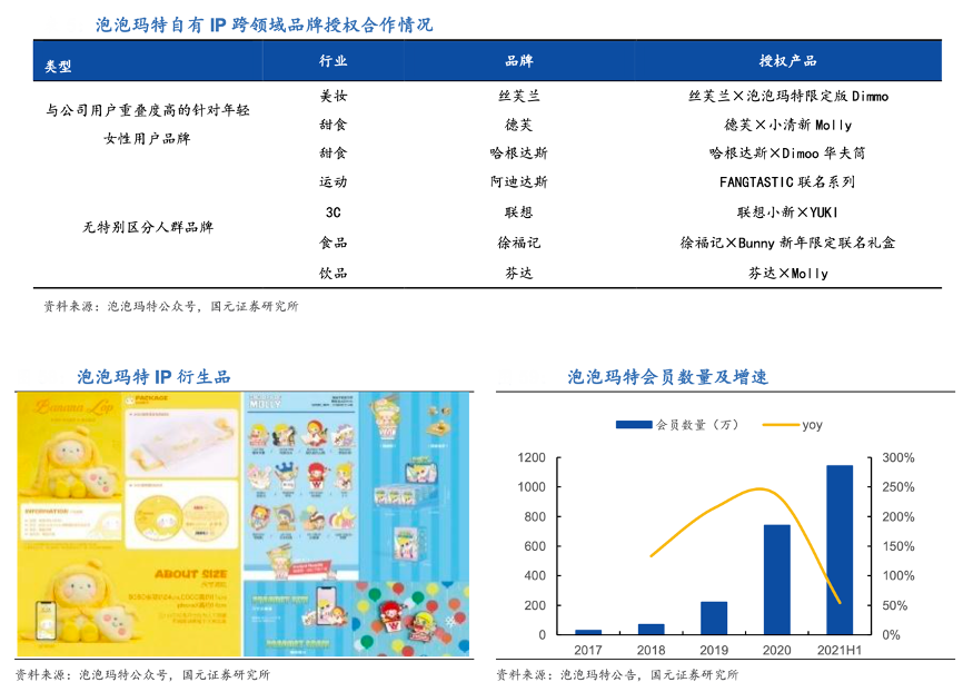 經(jīng)典案例:根據(jù)泡泡瑪特公眾號、泡泡瑪特公告、國元證券研究所等綜合資訊表明,潮流零售品牌商多通過老IP 新造型新衍生品、連續(xù)舉辦主題展、授權(quán)跨領(lǐng)域聯(lián)名等方式提升 IP 影響力、延長 IP 生命周期。以泡泡瑪 特為例,其 于2019年底至 2020 年初在中國七大城市連續(xù)舉辦以熱門 IP 為核心 的主題展,在此期間宣傳、促銷節(jié)日或地區(qū)限定產(chǎn)品;與絲芙蘭、德芙、哈根達斯、 阿迪達斯運動、徐福記、芬達等多行業(yè)品牌推出聯(lián)名商品,提升 IP 知名度。根據(jù)泡泡瑪特公告,2021H1 公司會員數(shù)量達 1141.5 萬人,同比增長 54%,會員復(fù)購率達 49%,會員銷售額貢獻達 91.8%。