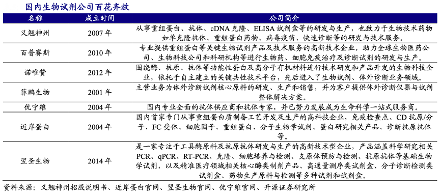 經(jīng)典品牌:根據(jù)義翹神州招股說明書、近岸蛋白官網(wǎng)、翌圣生物官網(wǎng)、開源證券研究所等綜合資訊表明,國內(nèi)代表性的生物試劑公司多數(shù)成立于2000年以后,至今已有近 20 年的發(fā)展歷史,現(xiàn)已形成各自的特色:義翹神州業(yè)務(wù)包括重組蛋白、抗體、基因和培養(yǎng)基等 產(chǎn)品,種類較為齊全;百普賽斯精耕細(xì)作重組蛋白細(xì)分領(lǐng)域,專業(yè)提供重組蛋白等關(guān)鍵生物試劑產(chǎn)品等。