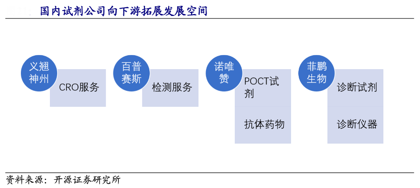 經(jīng)典案例:根據(jù)開源證券研究所等綜合資訊表明,依托在上游生物試劑研發(fā)、生產(chǎn)等優(yōu)勢,各公司在不斷開發(fā)生物試劑產(chǎn)品種類的同時(shí),紛紛向下游客戶拓展附加服務(wù)或開發(fā)下游終端產(chǎn)品,進(jìn)一步打開公司的發(fā)展空間。義翹神州可以向科研單位及醫(yī)藥研發(fā)、生物技術(shù)企業(yè)提供重組蛋白表達(dá)純化、抗體開發(fā)與生產(chǎn)等定制化服務(wù);百普賽斯為下游客戶提供分子互作分析檢測、抗獨(dú)特型抗體開發(fā)的檢測服務(wù)等。