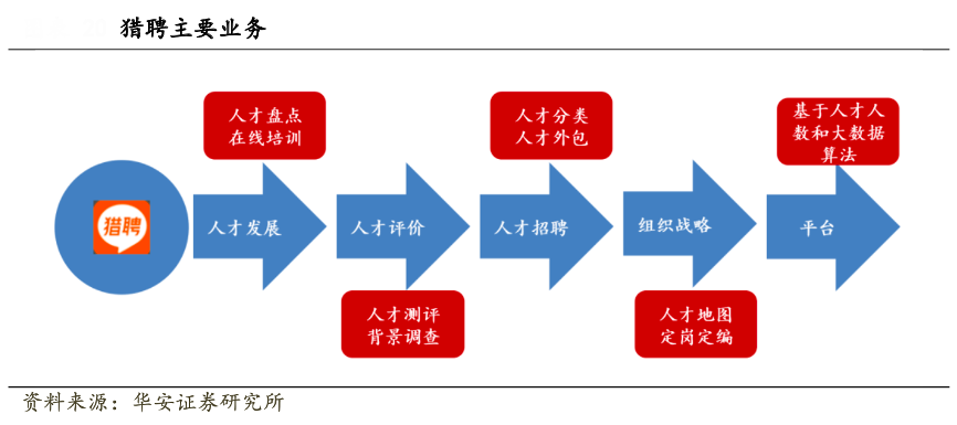 經(jīng)典案例:根據(jù)公開資訊、華安證券研究所等綜合資訊表明,同道獵聘是一家以科技和大數(shù)據(jù)驅(qū)動的人才服務智能平臺,其核心業(yè)務是中高端人才招聘平臺,將求職和招聘活動線上化,基于大數(shù)據(jù)與人工智能搭建以“獵聘網(wǎng)”為基礎(chǔ)的互聯(lián)網(wǎng)平臺,開啟以用戶體驗為核心的交易模式。獵聘布局人力資源產(chǎn)業(yè)鏈,提供一體化人才解決方案。