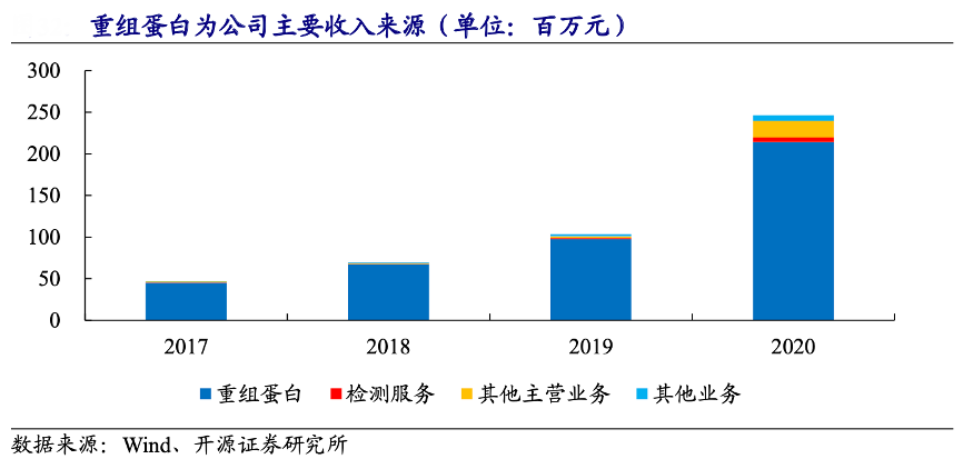 經(jīng)典案例:根據(jù)wind、開源證券研究所等綜合資訊表明,分業(yè)務(wù)看,現(xiàn)階段“重組蛋白”是百普賽斯公司收入的主要來源,同時(shí),借助其超過 1700 種的重組蛋白積極拓展藥物的研發(fā)、篩選、臨床試驗(yàn)、生產(chǎn)質(zhì)量監(jiān)控等檢測(cè)服務(wù), 該業(yè)務(wù)的收入規(guī)模穩(wěn)步提升。
