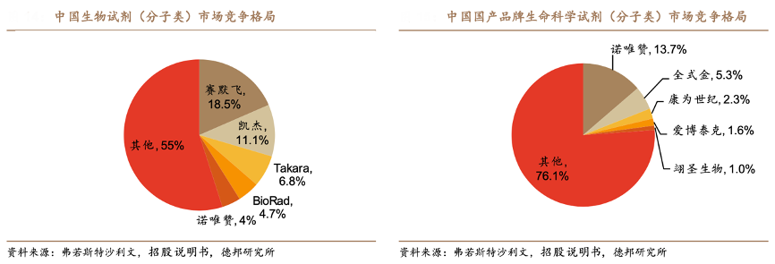經(jīng)典案例:根據(jù)弗若斯特沙利文、招股說明書、德邦研究所等綜合資訊表明,2020年在我國分子類生物試劑市場中,諾唯贊公司占有約4.0%的市場份額,排名第五,在國內(nèi)廠商中排名第一。賽默飛、凱杰、寶生物、BioRad四個(gè)國外企業(yè)合計(jì)占據(jù)超過40%的市場份額,國內(nèi)產(chǎn)品的進(jìn)口替代空間較大。國內(nèi)分子類生物試劑廠商市場格局較為分散,主要龍頭企業(yè)包括諾唯贊、全式金、翊圣生物、愛博泰克、康為世紀(jì)等。