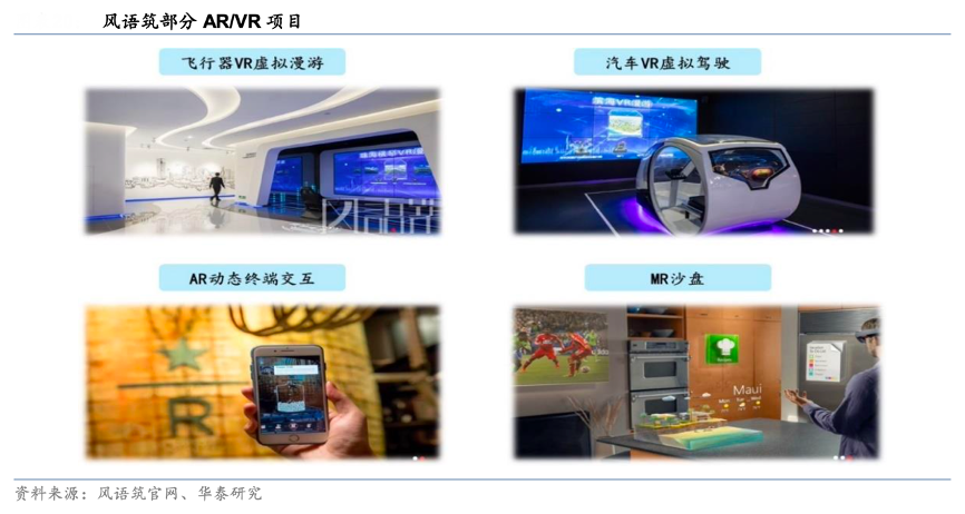 經(jīng)典案例:根據(jù)風(fēng)語(yǔ)筑官網(wǎng)、華泰研究等綜合資訊表明,風(fēng)語(yǔ)筑將 AR/VR 技術(shù)應(yīng)用于展覽展示主業(yè),在 2020 世界 VR 產(chǎn)業(yè)大會(huì)上榮獲“中國(guó) VR 50 強(qiáng)”。憑借其豐富技術(shù)儲(chǔ)備,目前風(fēng)語(yǔ)筑具備獨(dú)立開發(fā) VR 項(xiàng)目的能力,并結(jié)合全息影像、 裸眼 3D 技術(shù)等技術(shù)打造沉浸式交互體驗(yàn),率先在業(yè)內(nèi)實(shí)現(xiàn) AR/VR 等技術(shù)的規(guī)?;虡I(yè)應(yīng) 用,在 2020 年世界 VR 產(chǎn)業(yè)大會(huì)上獲得“中國(guó) VR 50 強(qiáng)”。