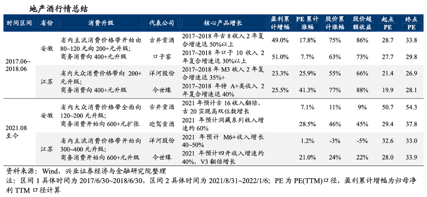 經(jīng)典案例:根據(jù)wind、興業(yè)證券經(jīng)濟與金融研究院等綜合資訊表明,目前區(qū)域龍頭重新步入產(chǎn)品結(jié)構(gòu)加速升級階段,迎駕洞藏、今世緣四開實現(xiàn)放量 增長,古井、洋河則在省內(nèi) 600~800 元超次高端價格帶成功建立規(guī)模優(yōu)勢,進一步構(gòu)筑品牌壁壘。參考 2017~2018 年周期時長,預(yù)計地產(chǎn)酒景氣在 2022 年仍將延 續(xù),在 2020-2021 地產(chǎn)酒結(jié)構(gòu)升級主線仍然鮮明突出。