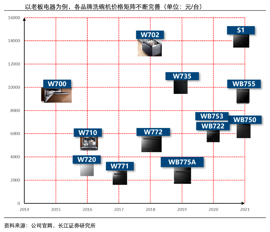 經(jīng)典案例:根據(jù)公司官網(wǎng)、長(zhǎng)江證券研究所等綜合資訊表明,以老板為例,自其 2015 年推出第一 款售價(jià)破萬(wàn)元的洗碗機(jī) W700 后,又推出數(shù)款價(jià)位更低的產(chǎn)品,滿足不同收入水平和價(jià)格接受度的用戶需求。各品牌洗碗機(jī)價(jià)格矩陣不斷完善。