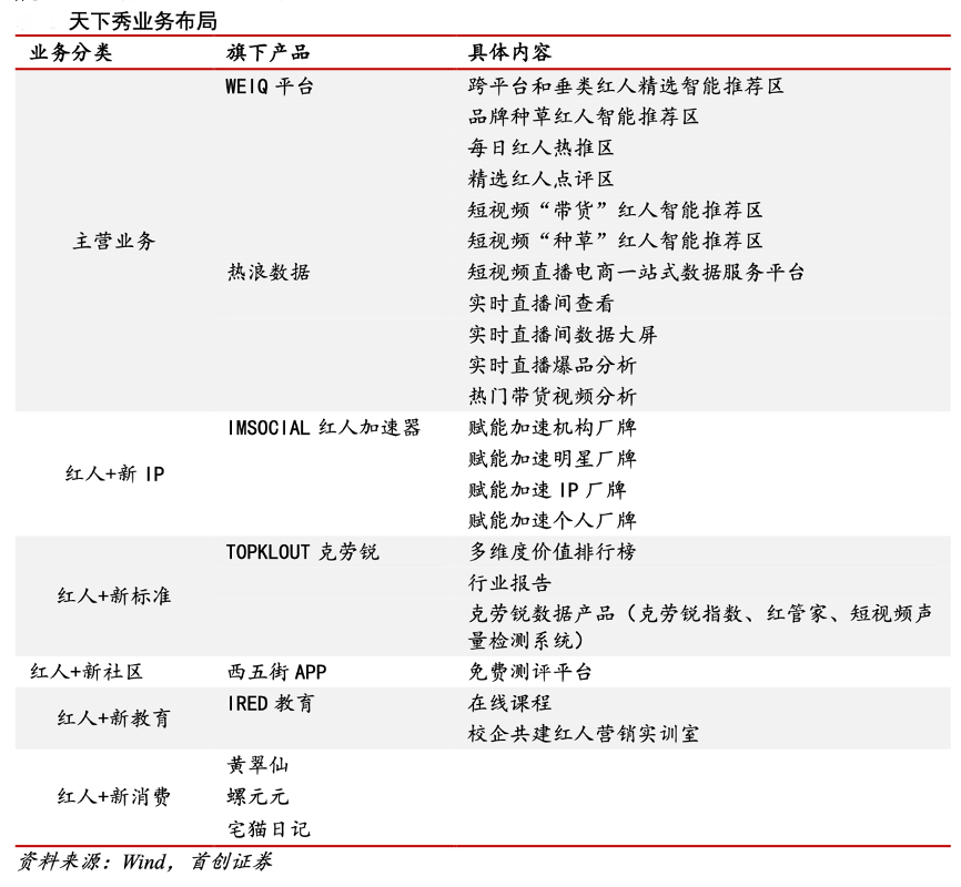 經(jīng)典案例:根據(jù)wind、首創(chuàng)證券等綜合資訊表明,天下秀以紅人營(yíng)銷為主營(yíng)業(yè)務(wù),配套推出“紅人+新 IP”、“紅人+新標(biāo)準(zhǔn)”、“紅人+新社區(qū)”、“紅人+新 職業(yè)”、“紅人+新消費(fèi)”等紅人經(jīng)濟(jì)生態(tài)鏈創(chuàng)新性業(yè)務(wù),紅人經(jīng)濟(jì)業(yè)務(wù)布局日漸完善。截至 2021 年上半年,WEIQ 平臺(tái)的活躍商家客戶數(shù)已達(dá)到 5,165 個(gè),為 2020 年全年客 戶數(shù)的61.92%。