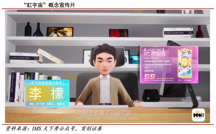 經(jīng)典案例:根據(jù)IMS天下秀公眾號、首創(chuàng)證券等綜合資訊表明,“虹宇宙”是天下秀于2011年推出的虛擬社交產(chǎn)品“火星微社區(qū)”的 2.0 版本,其實現(xiàn)了紅人經(jīng)濟與新 場景的結(jié)合,增強了紅人與粉絲之間的互動性。在“虹宇宙”世界里,用戶可體會三維的數(shù)字化社交方式,更沉浸的進行工作與學習;內(nèi)容創(chuàng)作者的社交資產(chǎn)由用戶定 義,內(nèi)容制作、工具應用和收入實現(xiàn)更加便捷順暢。