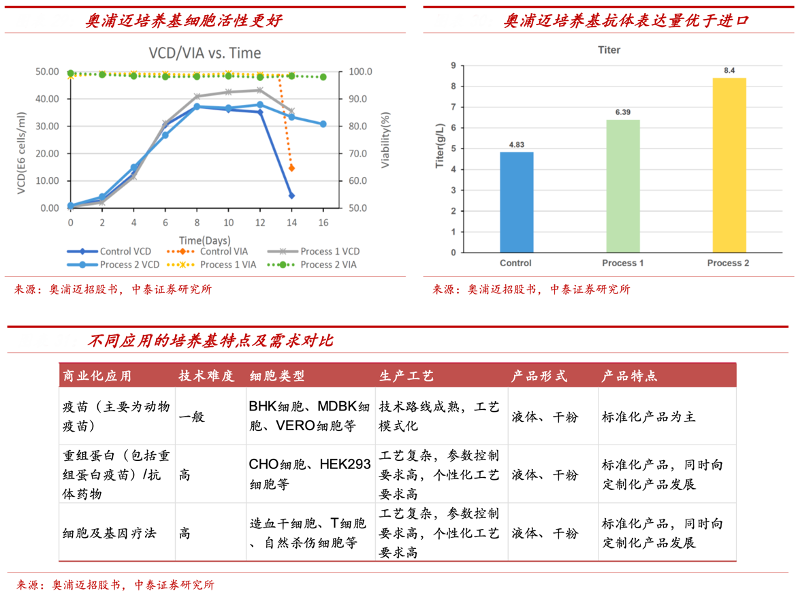 經(jīng)典案例:根據(jù)奧浦邁招股書、中泰證券研究所等綜合資訊表明,培養(yǎng)基產(chǎn)品的核心技術(shù)點(diǎn)在于配方的保密性以及根據(jù)不同細(xì)胞種類的優(yōu)化調(diào)整,一套培養(yǎng)基可能包含 70-100 種不同成分。過去中國培養(yǎng)基一直被進(jìn)口品牌 壟斷就是因?yàn)槿狈ε囵B(yǎng)基配方開發(fā)的核心技術(shù),近年來,國產(chǎn)企業(yè)如奧 浦邁、吉泰依克賽等企業(yè)完成了多種培養(yǎng)基的開發(fā),掌握了提升產(chǎn)物表 達(dá)量的核心技術(shù),逐漸實(shí)現(xiàn)進(jìn)口替代。