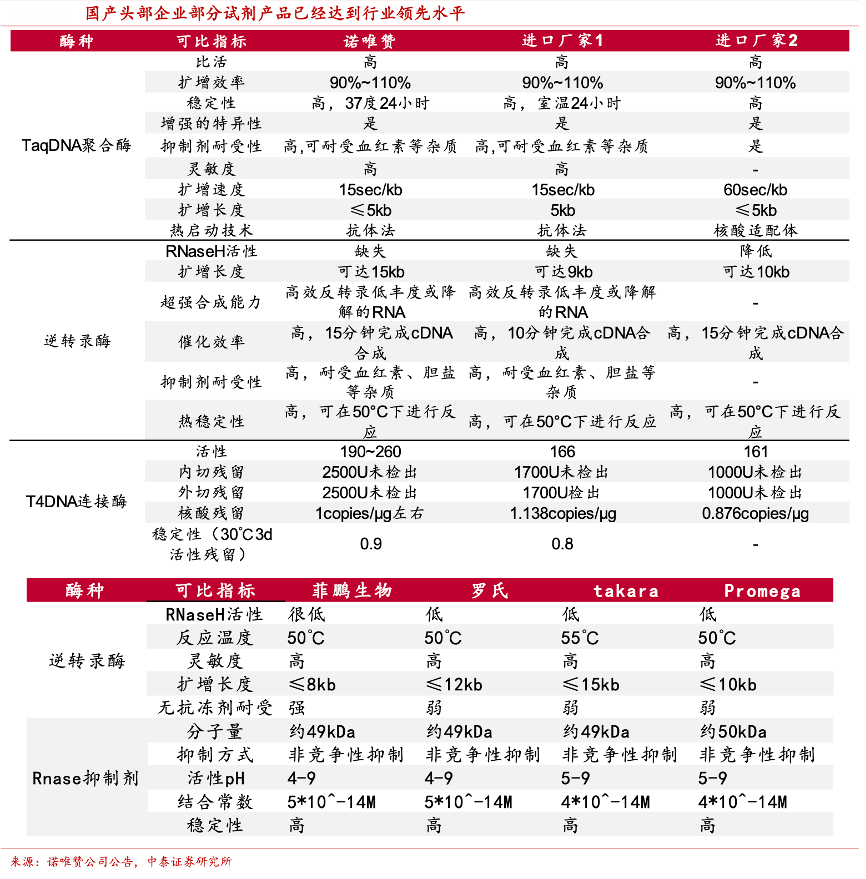 經(jīng)典案例:根據(jù)諾唯贊公司公告、中泰證券研究所等綜合資訊表明,近年來,以諾唯贊等為代表的國產(chǎn)生物試劑企業(yè)自主開發(fā)底層的平臺技術(shù),在分子試劑方面,諾唯贊、菲鵬生物等的幾類產(chǎn)品,如常見的 DNA 聚合酶、內(nèi)切酶均已不弱于甚至優(yōu)于海外產(chǎn)品;蛋白試劑方面,百普賽斯圍繞人源 HEK293細(xì)胞開發(fā)的重組蛋白所提供的應(yīng)用數(shù)據(jù)也顯著優(yōu)于同行競對。