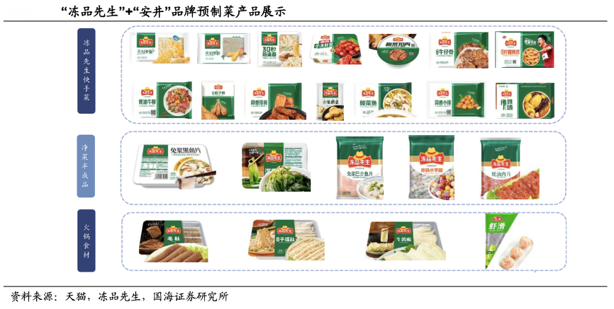 經(jīng)典案例:根據(jù)天貓、凍品先生、國海證券研究所等綜合資訊表明,安井食品 公司是速凍食品行業(yè)龍頭,2020 年收入和歸母凈利潤分別為 69.96 億元和 6.04 億元。主要產(chǎn)品包括速凍魚糜制品、速凍肉制品、速凍面米制品以及菜肴制品。其于2018年H2推出子品牌“凍品先生”,前期定位餐飲食材產(chǎn)品,采取輕資產(chǎn) OEM 運(yùn)營模式,截止2021年Q3,菜肴制品規(guī)模達(dá)到了9.2億元,同比增長126%,其中預(yù)計(jì) 2021 年預(yù)制菜產(chǎn)品收入達(dá)到 3 億元。