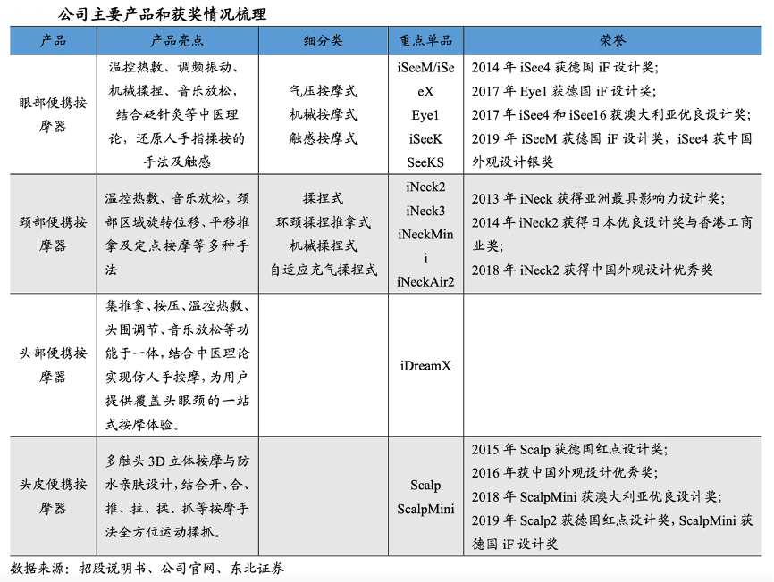 經(jīng)典案例:根據(jù)招股說明書、公司官網(wǎng)、東北證券等綜合資訊表明,倍輕松公司產(chǎn)品一方面通過“動力+機(jī)械+材料+溫濕度”的結(jié)合,達(dá)到了最接近于真人的體驗(yàn);另一方面,產(chǎn)品的外觀設(shè)計(jì)持續(xù)迭代創(chuàng)新,主打“智能便攜”,旗下幾乎每個(gè)爆款產(chǎn)品均獲得過相關(guān)領(lǐng)域設(shè)計(jì)獎項(xiàng),產(chǎn)品設(shè)計(jì)能力行業(yè)領(lǐng)先,高端品牌調(diào)性十足。