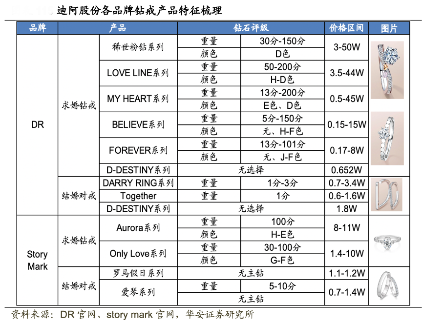 經(jīng)典案例:根據(jù)DR官網(wǎng)、story mark官網(wǎng)、華安證券研究所等綜合資訊表明,迪阿股份公司品牌主要包括主品 牌 DR 及子品牌 Story Mark 和 Most Me。子品牌當(dāng)前處于培育期,DR 貢獻(xiàn)主要營(yíng)收,2021H1 主品牌 DR 營(yíng)收占比達(dá) 99.9%。兩品牌主要產(chǎn)品均包含求婚鉆戒及結(jié)婚對(duì)戒,以及多個(gè)不同系列。不同系列定位不盡相同,但具備共同點(diǎn)為:(1)具備高價(jià)格帶產(chǎn)品系列:例如 DR 的稀世粉鉆系列(3-50 萬(wàn)元)以及 Story Mark 的 Aurora 系列(8-11 萬(wàn)元),配備有鉆重和成色更加優(yōu)秀的主鉆等。