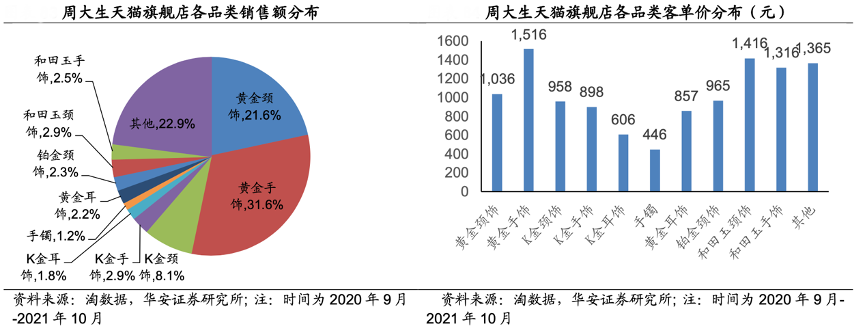 經(jīng)典案例:根據(jù)淘數(shù)據(jù)、華安證券研究所等綜合資訊表明,周大生主要布局一口價(jià)素金及銀飾等低單價(jià)+設(shè)計(jì)感強(qiáng)的配飾產(chǎn)品,打造高頻+低價(jià)+高復(fù)購(gòu)的快 消模式。其于2019年創(chuàng)立珠寶品牌 Design Circles,主打高性?xún)r(jià)比非金類(lèi)社交珠寶。據(jù)淘數(shù)據(jù)顯示,2020年 9 月-2021 年 10 月周大生天貓旗艦店各品類(lèi)中黃金頸飾、手飾占比較高,銷(xiāo)售額占比分別為 31.6%、21.6%。黃金飾品各品類(lèi)客單價(jià)處于 446-1516 之間。